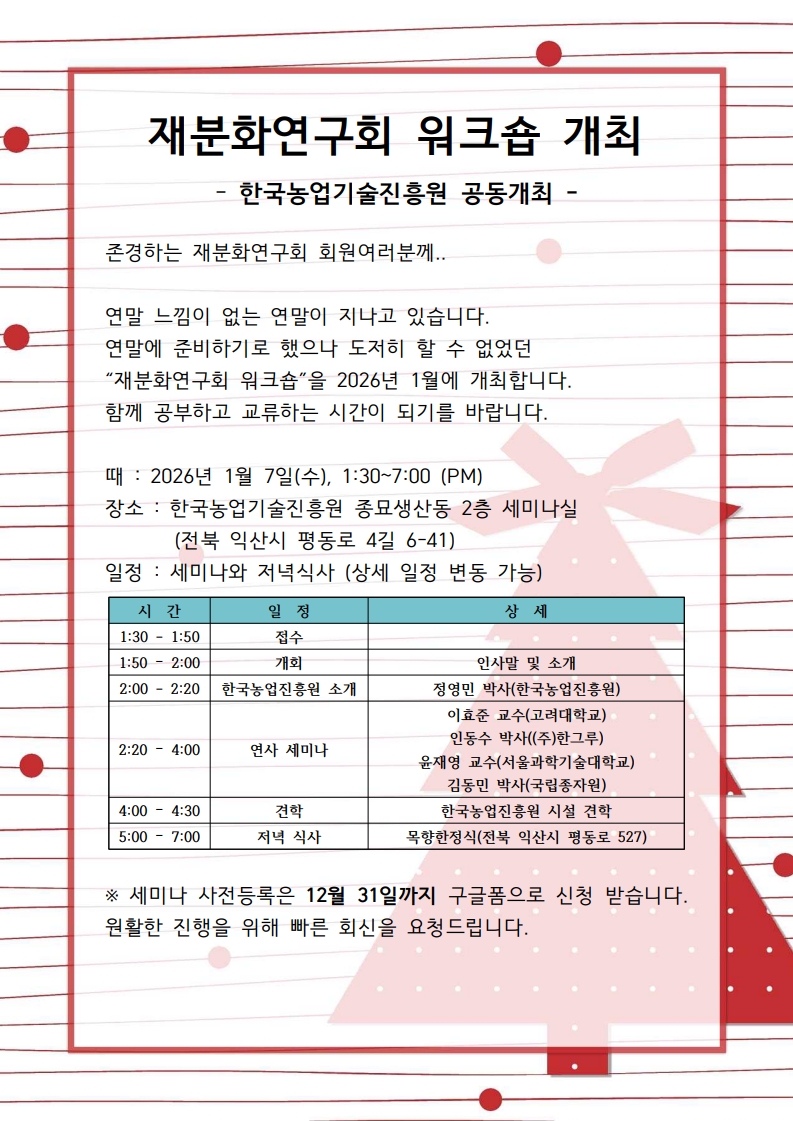 공지사항 및 학회소식 home 커뮤니티 공지사항 및 학회소식 [재분화연구회] 2026년 재분화 연구회 워크숍 개최 작성자 관리자 조회 32 작성일 2025.12.29 첨부파일 재분화연구회 워크숍 초청장.pdf [155.633 KB] . 목록