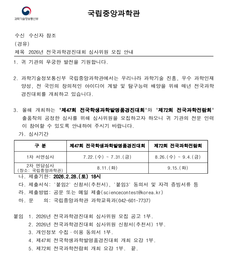 공지사항 및 학회소식 home 커뮤니티 공지사항 및 학회소식 [공고]2026년 전국과학경진대회 심사위원 모집 안내 작성자 관리자 조회 45 작성일 2026.01.20 첨부파일 [본문] 2026년 전국과학경진대회 심사위원 모집 안내.pdf [229.714 KB] 제47회 전국학생과학발명품경진대회 개최 요강.pdf [585.522 KB] 목록